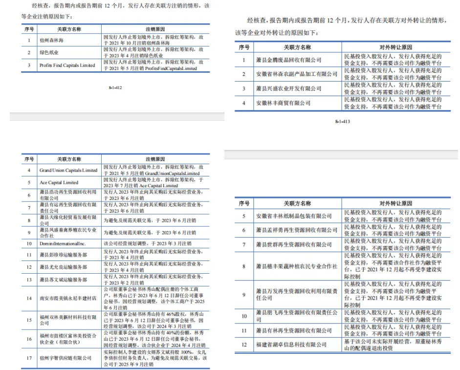 值得一提的是,报告期内,林平发展突击注销多达17家关联方,包括宿州森林海、绿色纸业、萧县浩功再生资源回收利用有限公司、萧县有运再生资源回收有限责任公司等。其注销原因包括“因发行人终止筹划境外上市,拆除红筹架构”、“为避免及规范关联交易”、“发行人2023年终止向其采购后无实际经营业务”等。