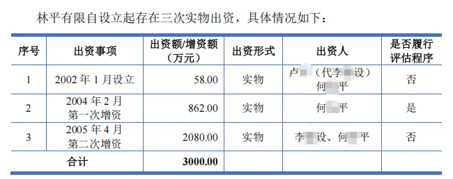 林平发展前身林平有限公司成立于2002年1月,其早年出资时实物资产未评估,直至2022年实控人才以现金置换补救。