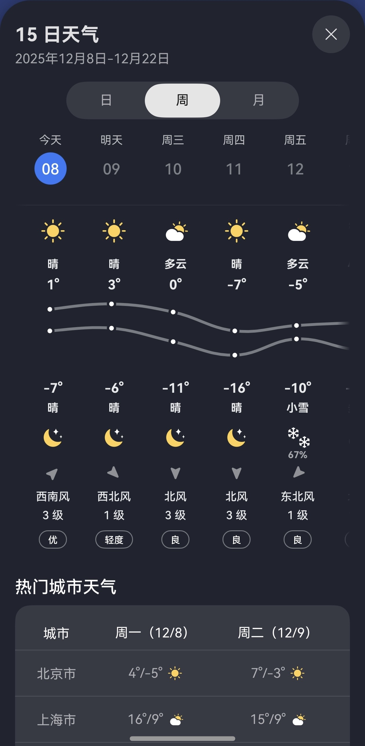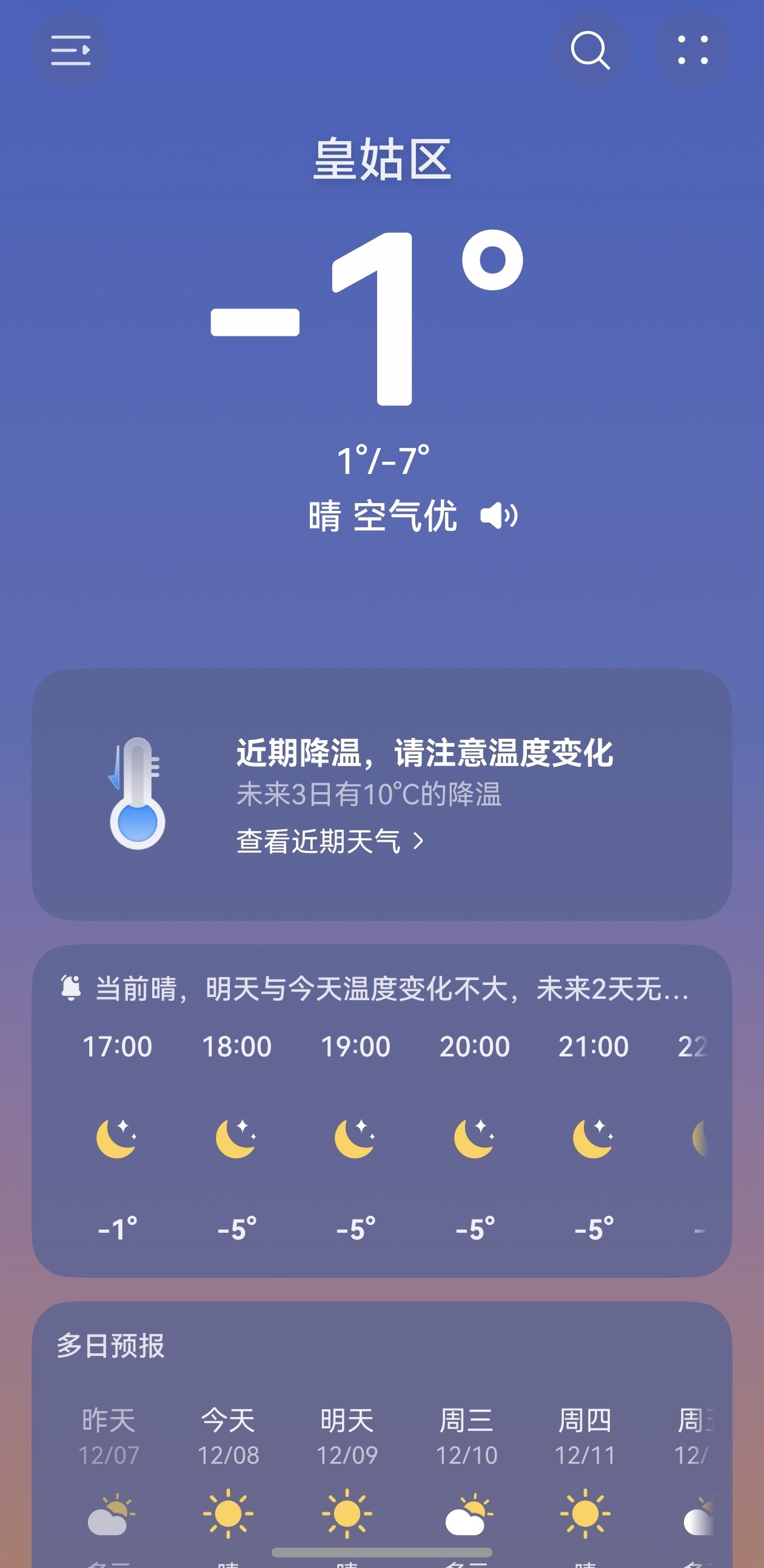 十月下旬的“夏冬春”更是神奇,在短短的几天内,直接从夏天跳到了冬天,秋季直接就没有了,真的太夸张了。不过好在那时候华为天气的首页智能卡也及时提前预报,不然的话很容易冻感冒。现在在沈阳,还提醒我明日升温,注意调整衣物,简直不要太贴心了。