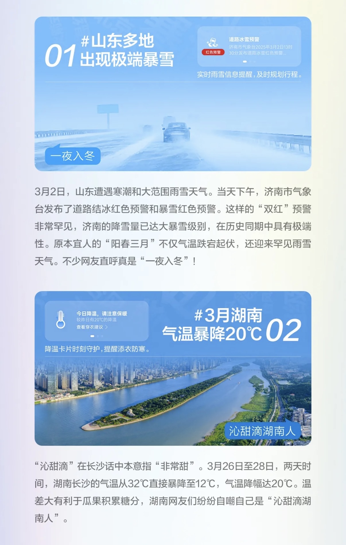 2025年的天气感觉很怪,它就像哆啦A梦的口袋,永远不知道能够从里面掏出什么,你也不知道上午的天气和下午的天气,会相差多大的差别。这回华为天气发布了年度榜单,很像一本趣味日记,记录了这一年的大自然天气“调皮”时刻。
