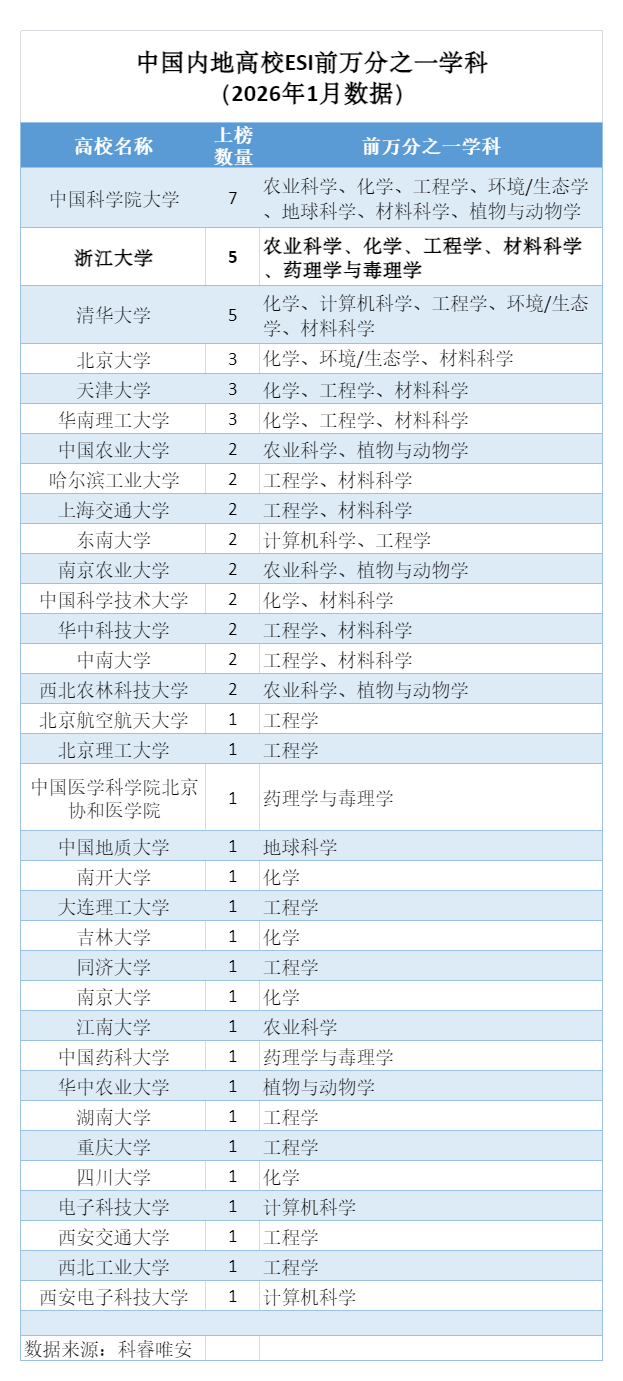 中国内地高校ESI前万分之一学科,浙江大学数量排第二