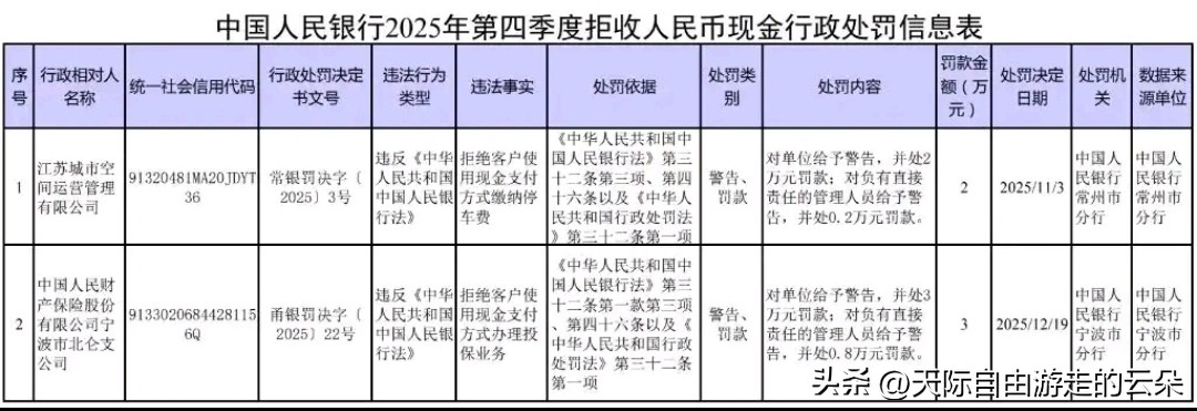 2026年1月22日,中国人民银行官网发布一则重磅消息:2025年第四季度,因拒收客户现金支付停车费、投保业务,江苏城市空间运营管理有限公司和中国人民财产保险股份有限公司宁波市北仑支公司分别被处以2万元、3万元罚款,相关责任人员也被警告并处罚款。这一举措再次释放了央行维护人民币法定货币地位、保障公众支付选择权的明确信号。