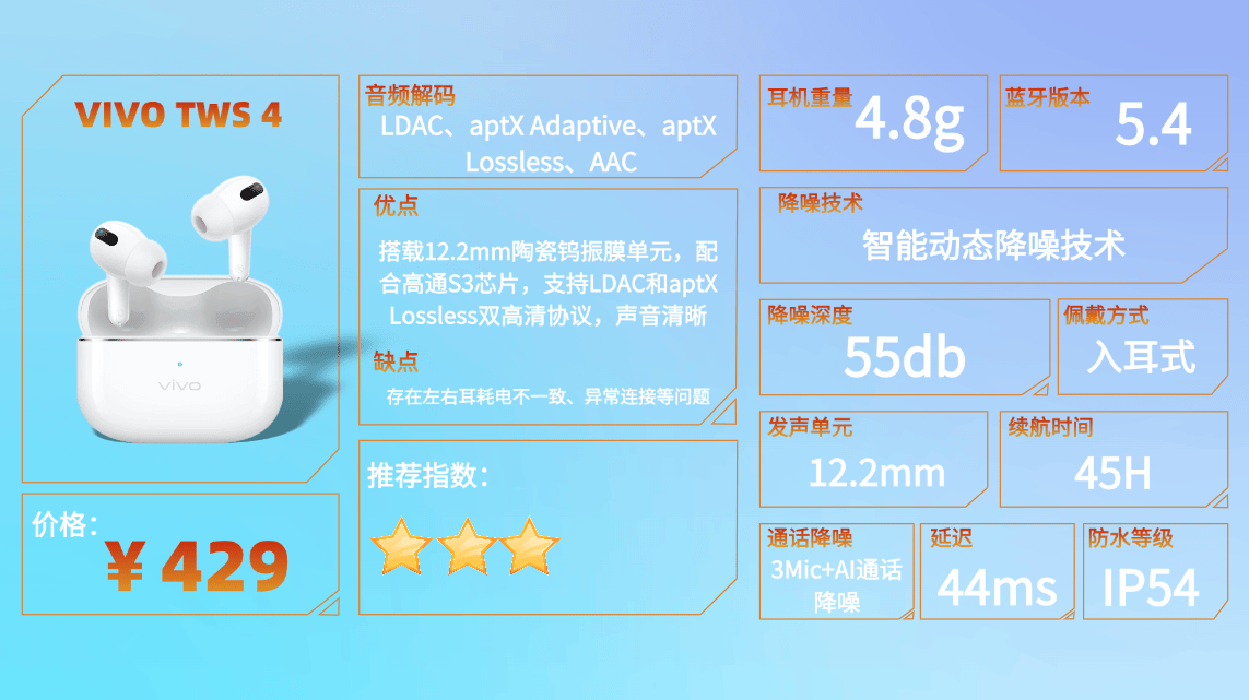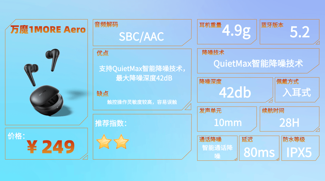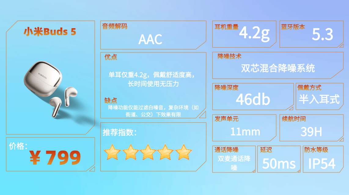◢技术参数:在佩戴体验上,这款耳机单边重量仅4.5g,几乎没有负担感,即使是通勤路上连续听歌或者在办公室长时间开会,也不容易出现耳朵疲劳。贴合度恰到好处,久戴也不会产生压迫感,对小耳道用户也比较友好。