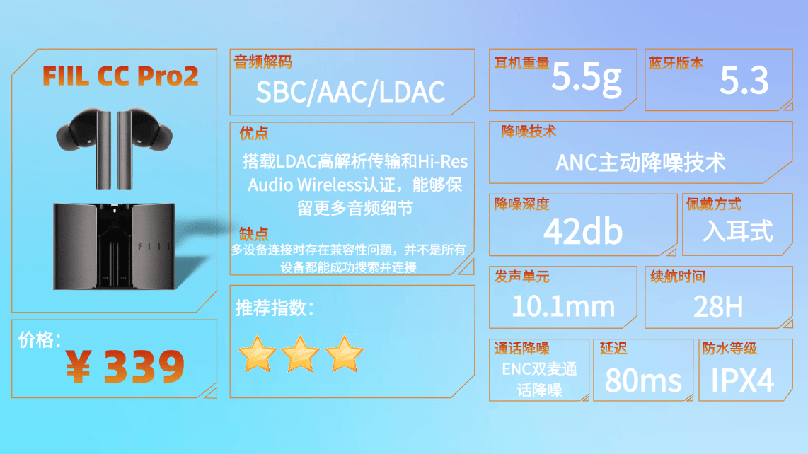 在声音方面,它通过Hi-Res小金标认证,支持LDAC高清编解码,硬件上配备13mm生物复合振膜、N45高推力钕磁铁和超大动圈单元,使声音更有层次感和空间感,低频扎实,人声饱满。不过低频控制力和高频细节依旧有差距。蓝牙5.3保证了连接的稳定与流畅。续航方面表现不错,单次可用数小时,总续航可达30小时,并且支持快充,10分钟补能即可使用约2小时。