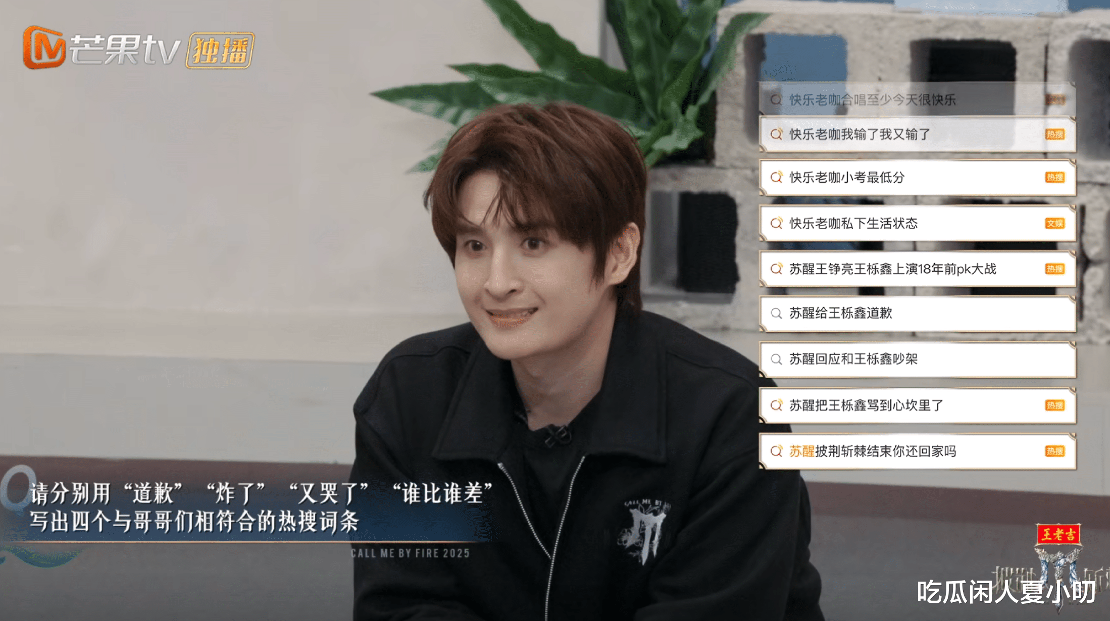 苏醒也不含糊,直接把之前的热搜“苏醒给王栎鑫道歉”作为答案;王铮亮的回答是“大小王炸了”,张远给的词条是:“张远又哭了,竟然是因为?”