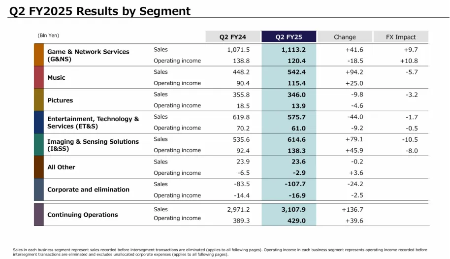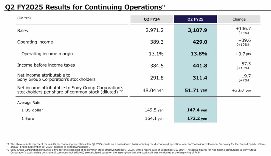 索尼集团公司(下称:索尼集团)今日公布2025财年第二季度(2025年7月1日——2025年9月30日)整体业绩数字,如下: