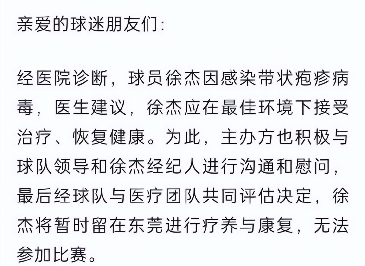 徐杰由于感染了水痘-带状疱疹病毒,所以暂时没有参加球队的训练。