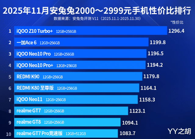 具体来说,在2025年11月份安兔兔2000—2999元手机性价比排行榜中,iQOO Z10 Turbo+和一加Ace 6分列第一名和第二名。在安兔兔平台上,这两款智能手机的性价比评分分别为1296.4分和1199.8分。其中,一加Ace 6支持165超高帧游戏体验,性能碾压同档,同时配备全新一代风驰游戏内核,实现行业领先的165无限满帧、同档最强的1%Low帧以及同档最强的游戏多任务、多窗满帧,综合游戏体验断档领先。