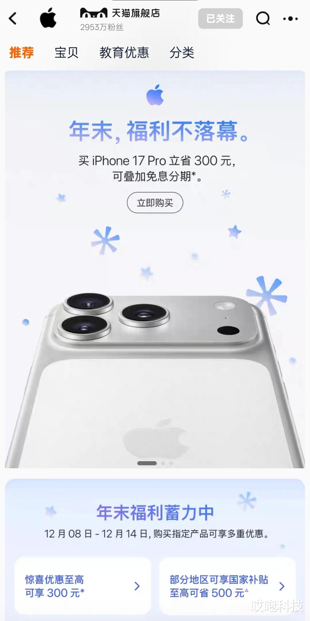 按苹果一贯的傲娇打法,新机刚发售三个月时间,官方价格应该属于“纹丝不动”阶段。结果 12 月 8 日开始,iPhone 17 Pro 系列就在天猫、京东这些官方和授权渠道直接官降 300 元:256GB 的 Pro 从 8999 元掉到 8699 元起,Pro Max 则从 9999 元变成 9699 元起。甚至部分地区还能叠加国家补贴,再便宜个 500 元...