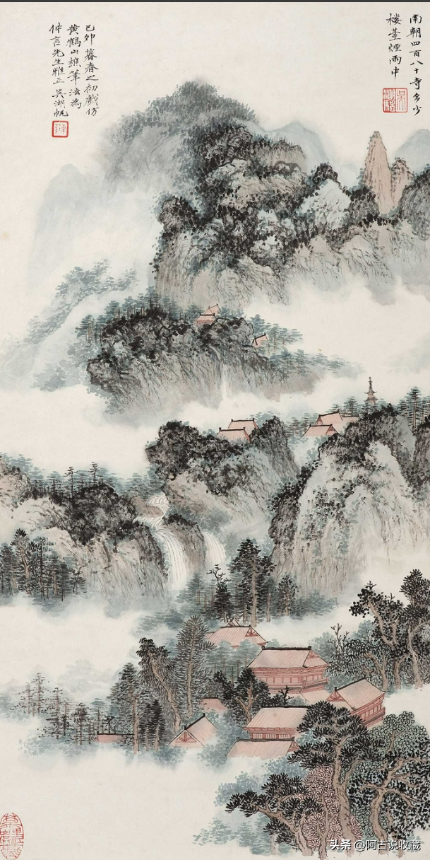 在今年邦瀚斯九月纽约亚洲艺术周中吴湖帆的《秋山萧寺》是作为焦点拍品的,设色纸本 镜框,1950年作,估价:80,000 – 120,000美元。