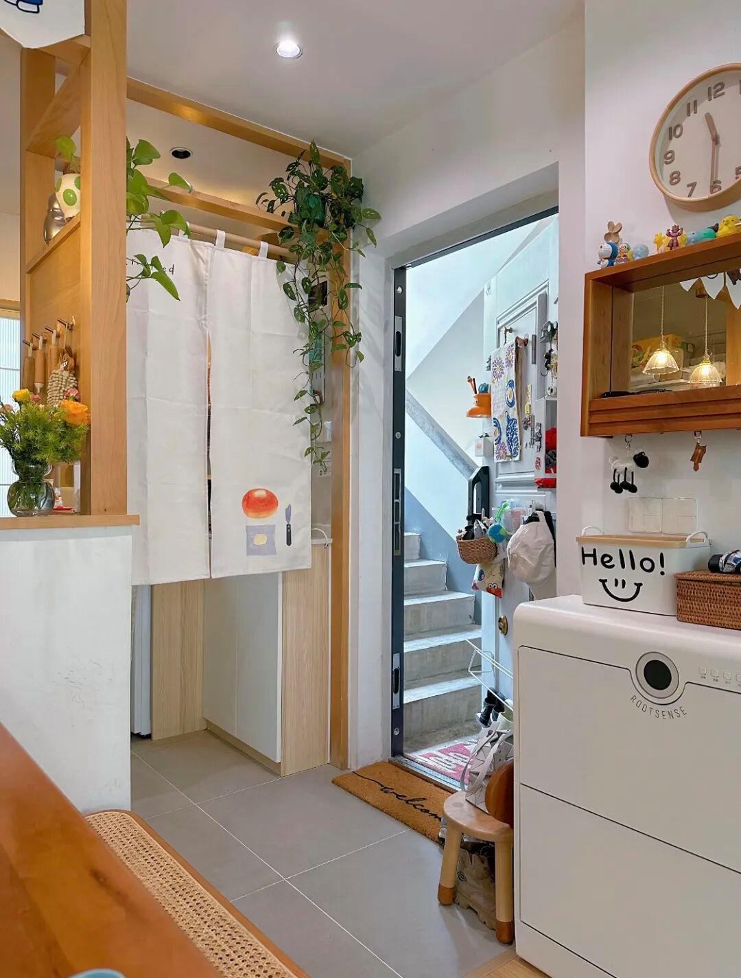 因为这个房子和很多老破小一样,没玄关,她又不想把鞋柜放在楼道,博主一开始想直接做一个高低差的日式落尘区,但是费用有些高,因为地面需要抬高,费用太多了,而且也担心小朋友、老人会绊脚,所以就将它取消了;