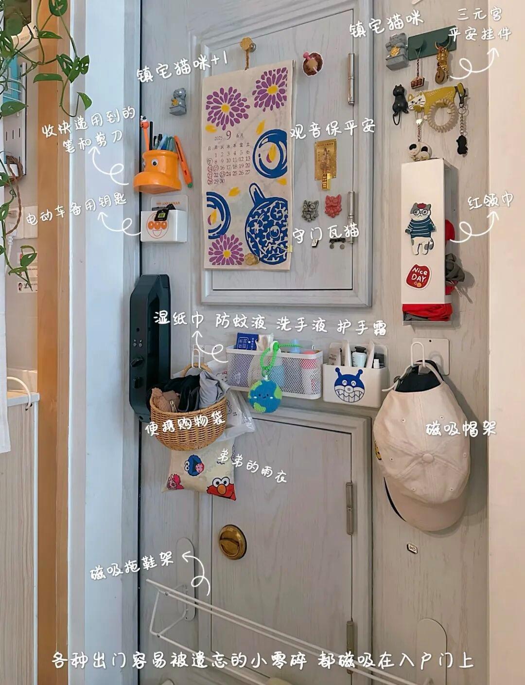 当然,最琳琅满目的空间,就是入户门磁吸了的一堆收纳盒,可以存放纸巾、口罩、猫铃、钥匙、购物袋、小摆件等;