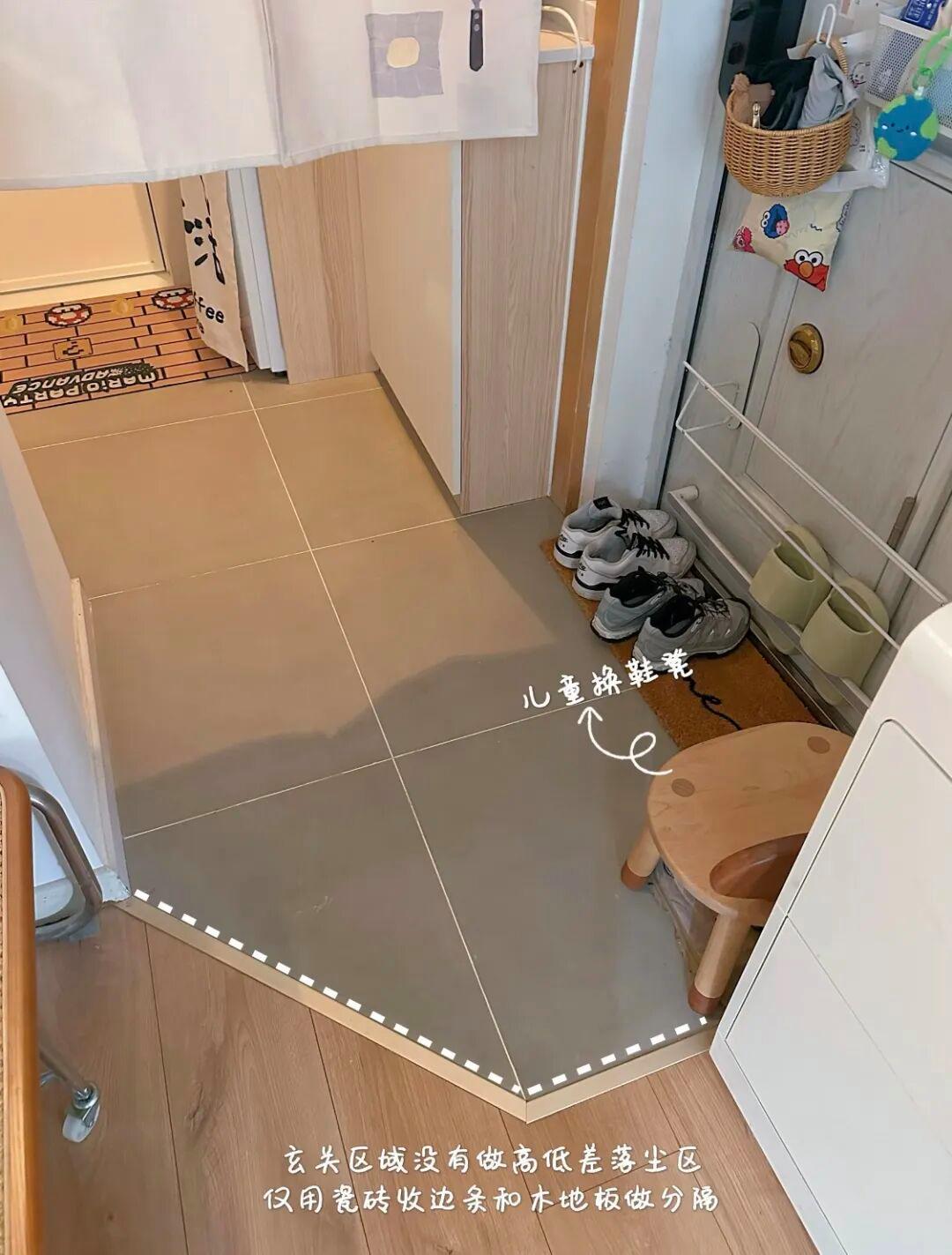 博主直接在瓷砖与木地板中间的踢脚线隔断,做了一个落尘区,利用材质区分区域,不做高低差也很好用,而且也更加安全。