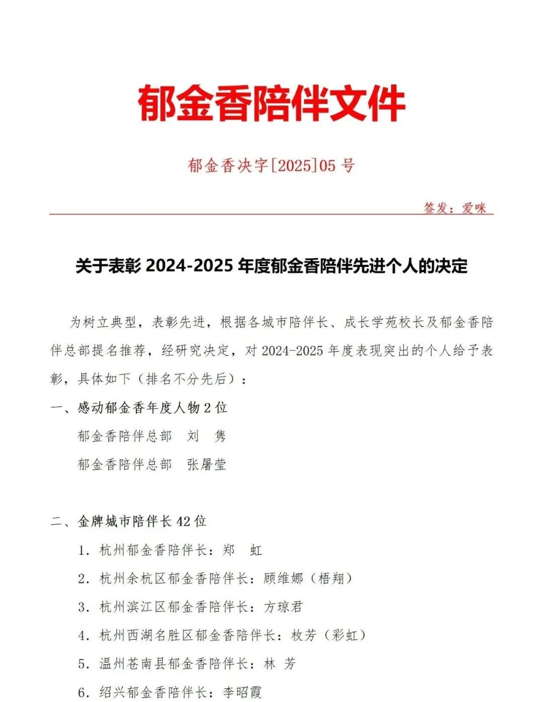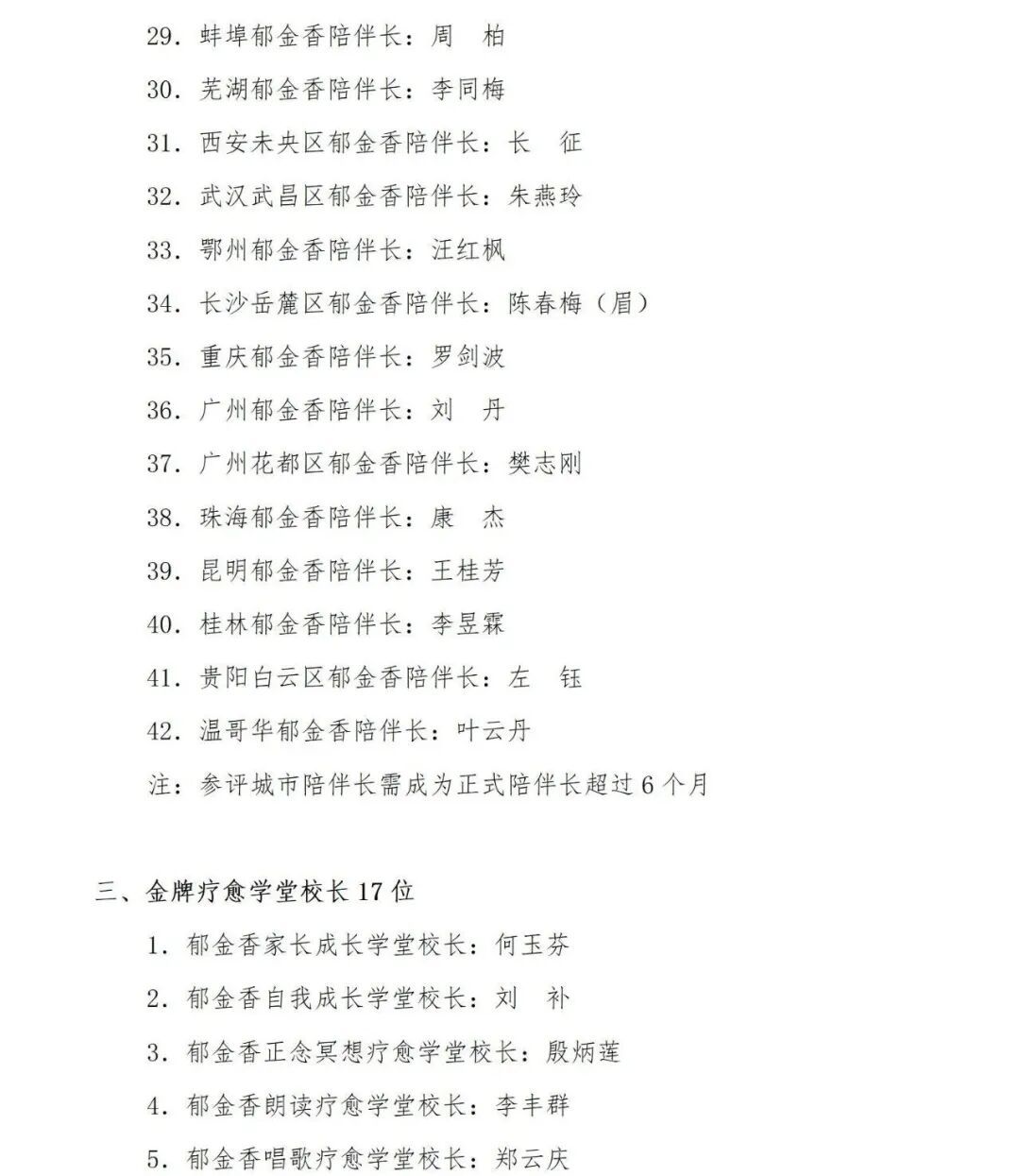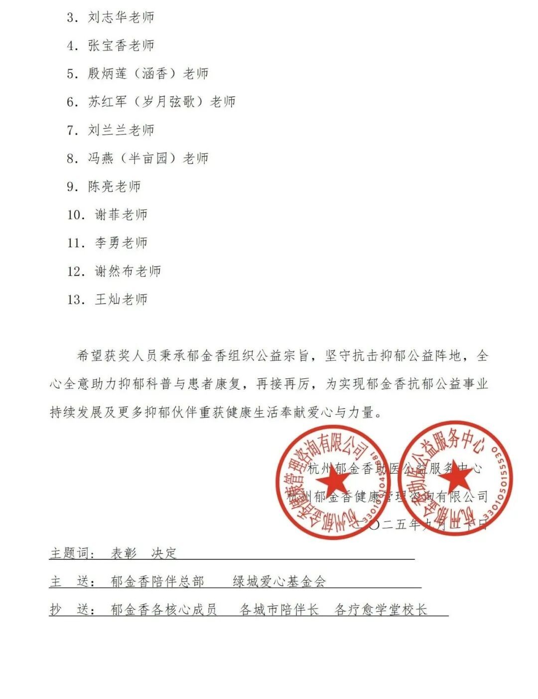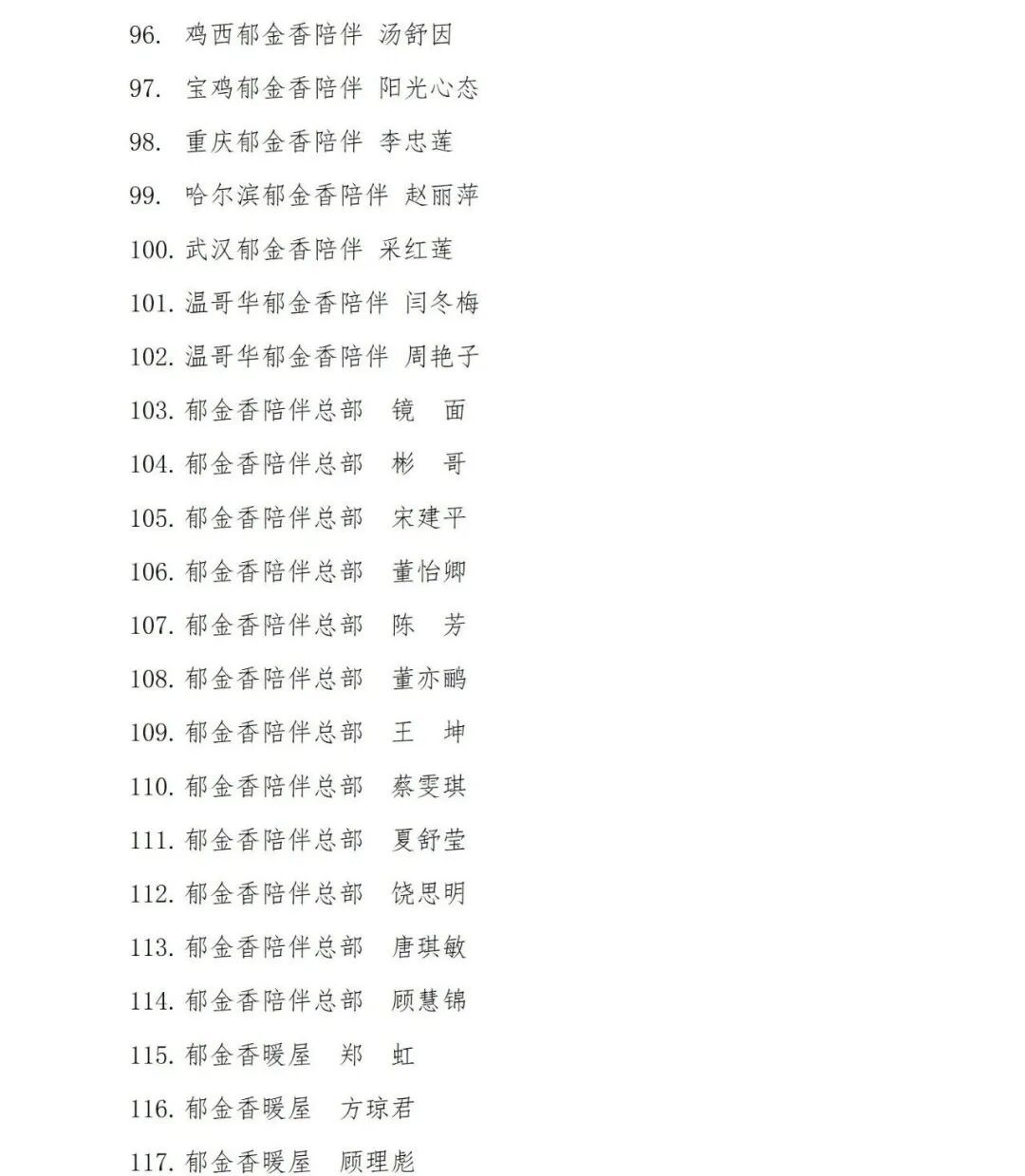 截止目前,郁金香线上陪伴社群超过850个线下城市覆盖超过300个聚集郁友及家属超过100000人聚集爱心志愿者超过3500人举办线下活动超过5000场举办主题论坛超过20次成功危机干预超过300起发布科普文章超过5000篇发布郁友康复故事超过1000篇自媒体平台覆盖超过20个陪伴者平台提供陪伴服务超过20000人次发放心理健康科普手册超过50万册成长学苑特色疗愈学堂超过40个特聘医学/心理学专家超过50个科普受益人群近1000万人在今年的第七届“绿城·无郁中国”抑郁康复论坛暨920郁友节,评选出感动郁金香年度人物、金牌陪伴长、金牌校长、金牌志愿者、金牌辅导员、金牌陪伴者、金牌康复之星和金牌导师总计511位先进个人,具体名单如下: