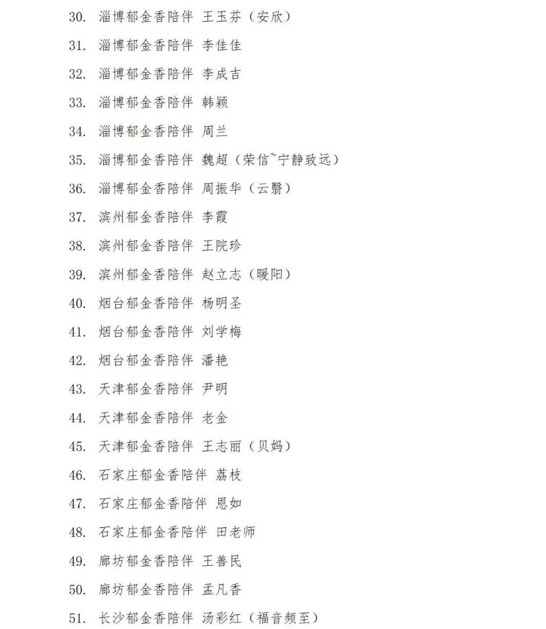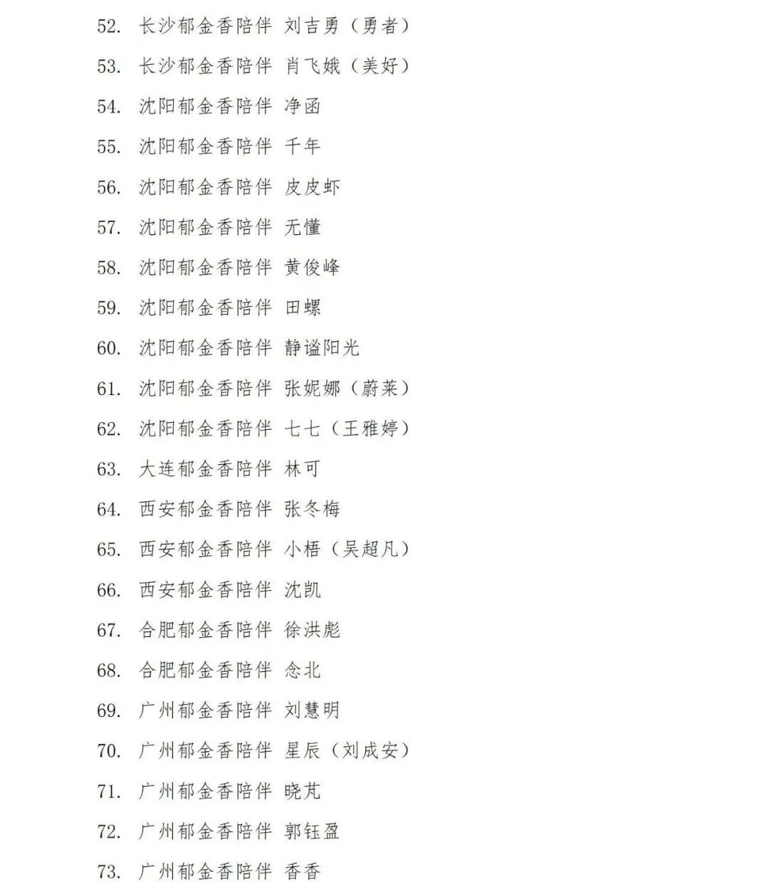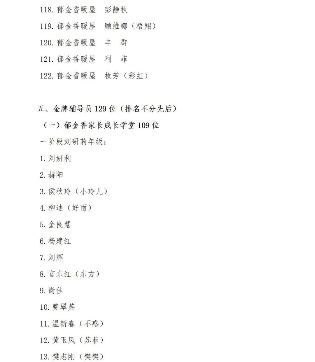 截止目前,郁金香线上陪伴社群超过850个线下城市覆盖超过300个聚集郁友及家属超过100000人聚集爱心志愿者超过3500人举办线下活动超过5000场举办主题论坛超过20次成功危机干预超过300起发布科普文章超过5000篇发布郁友康复故事超过1000篇自媒体平台覆盖超过20个陪伴者平台提供陪伴服务超过20000人次发放心理健康科普手册超过50万册成长学苑特色疗愈学堂超过40个特聘医学/心理学专家超过50个科普受益人群近1000万人在今年的第七届“绿城·无郁中国”抑郁康复论坛暨920郁友节,评选出感动郁金香年度人物、金牌陪伴长、金牌校长、金牌志愿者、金牌辅导员、金牌陪伴者、金牌康复之星和金牌导师总计511位先进个人,具体名单如下: