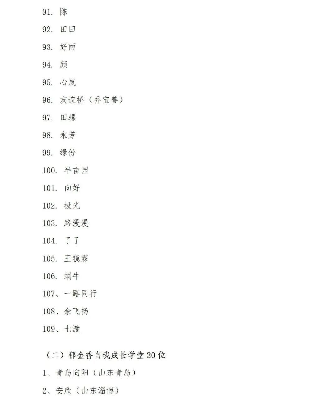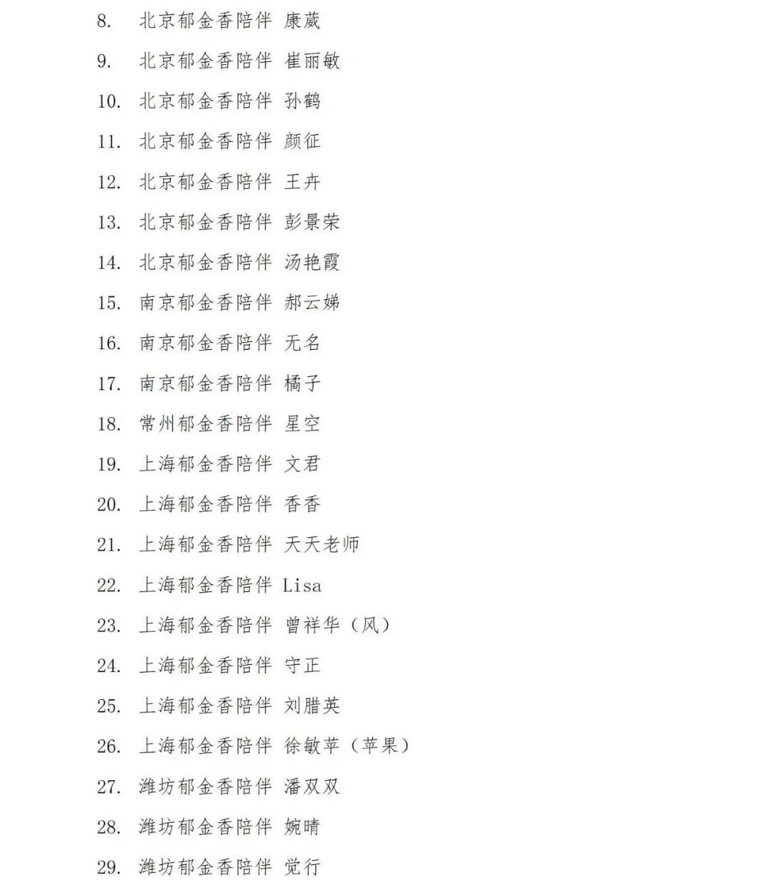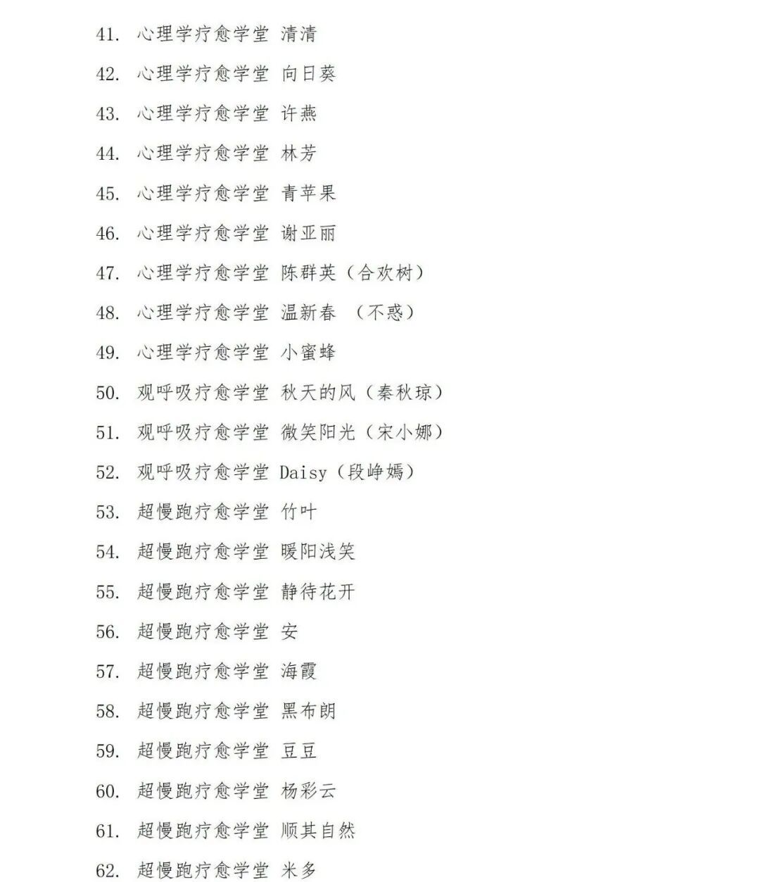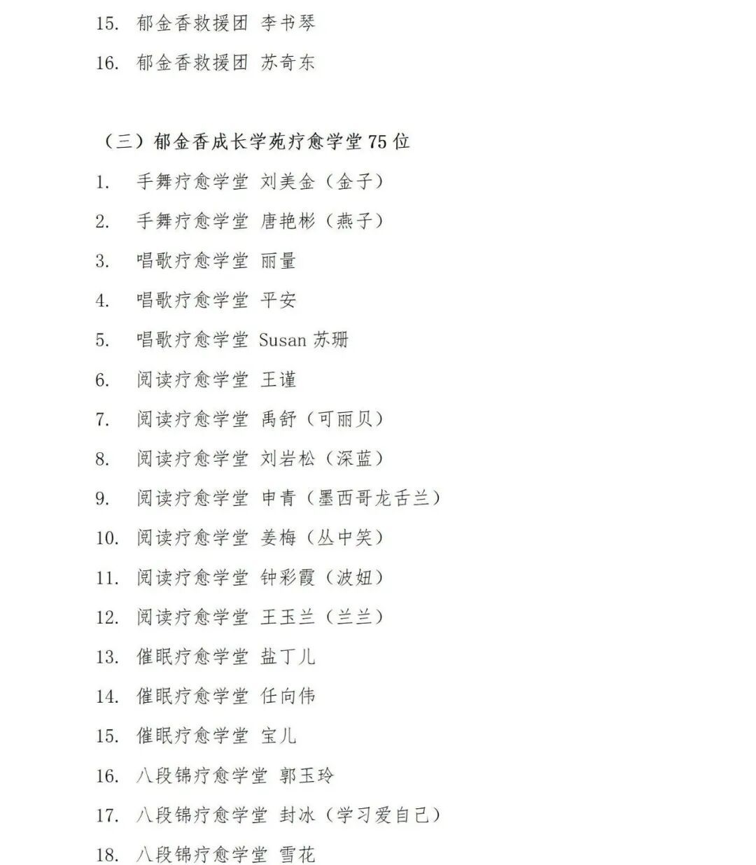 截止目前,郁金香线上陪伴社群超过850个线下城市覆盖超过300个聚集郁友及家属超过100000人聚集爱心志愿者超过3500人举办线下活动超过5000场举办主题论坛超过20次成功危机干预超过300起发布科普文章超过5000篇发布郁友康复故事超过1000篇自媒体平台覆盖超过20个陪伴者平台提供陪伴服务超过20000人次发放心理健康科普手册超过50万册成长学苑特色疗愈学堂超过40个特聘医学/心理学专家超过50个科普受益人群近1000万人在今年的第七届“绿城·无郁中国”抑郁康复论坛暨920郁友节,评选出感动郁金香年度人物、金牌陪伴长、金牌校长、金牌志愿者、金牌辅导员、金牌陪伴者、金牌康复之星和金牌导师总计511位先进个人,具体名单如下: