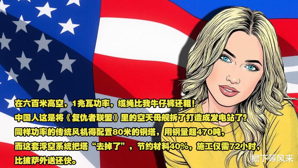 美国网友甩出一张截图道:在六百米高空,1兆瓦功率,缆绳比我牛仔裤还粗!中国人这是将《复仇者联盟》里的空天母舰拆了打造成发电站了?同样功率的传统风机得配置80米的钢塔,用钢量超470吨,而这套浮空系统把塔“去掉了”,节约材料40%,施工仅需72小时,比披萨外送还快。