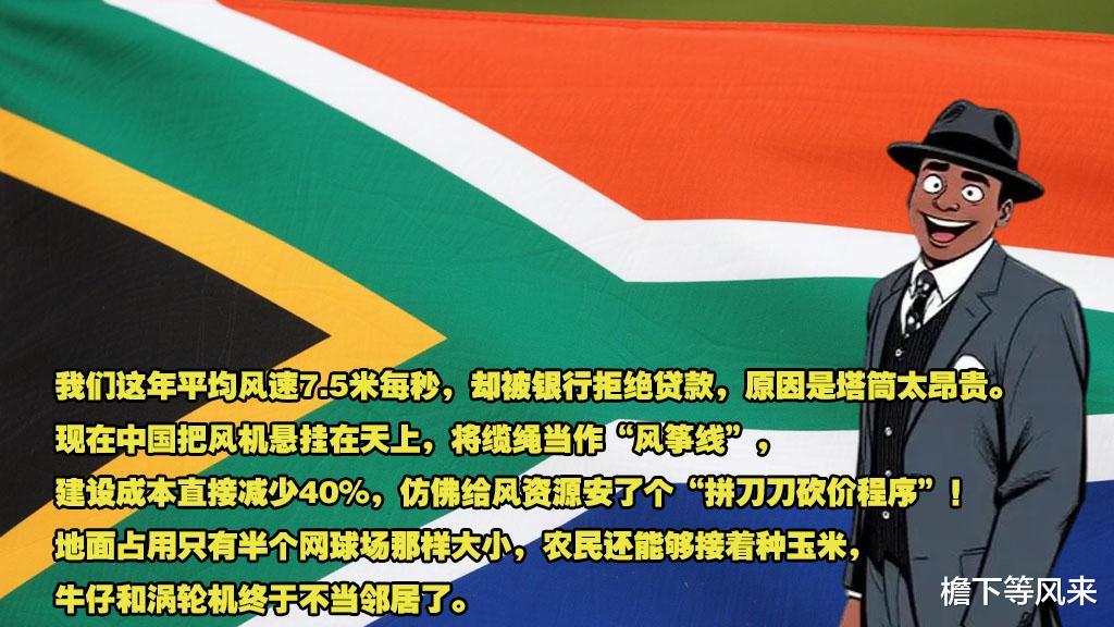 南非网友在评论区发一个“哭穷”表情包表示:我们这年平均风速7.5米每秒,却被银行拒绝贷款,原因是塔筒太昂贵。现在中国把风机悬挂在天上,将缆绳当作“风筝线”,建设成本直接减少40%,仿佛给风资源安了个“拼刀刀砍价程序”!地面占用只有半个网球场那样大小,农民还能够接着种玉米,牛仔和涡轮机终于不当邻居了。