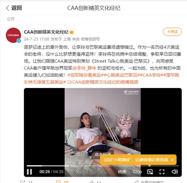 李玲在社交账号上表示她在前往巴黎前因为意外的伤病,只能止步在这届巴黎奥运会了。