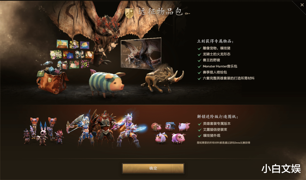 本次联动活动共推出6套全新的怪物猎人主题英雄外观与艾露猫信使供玩家免费获取,购买远征物品包即可解锁更多主题外观、噗吱猪、怪猎音乐包、赛季猎人喷漆等,最重磅的奖励是龙骑士的火龙形态,在社区内引发大量好评。推出“英雄狩猎”玩法来获取打造外观所需的材料,玩家需要在游戏对局中击杀敌方英雄来获取材料在局外打造饰品。
