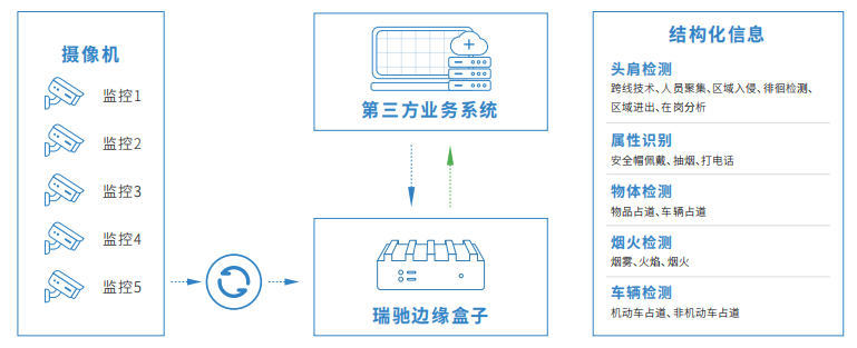 瑞驰AI边缘盒子基于ARM架构设计,在保证低功耗的同时实现高密度、高性能,满载澎湃算力,最大可支持16路1080P摄像头实时分析。对比传统大规模更换AI摄像头的升级方案,瑞驰的AI边缘盒子不仅具备丰富的算法,而且支持利旧原有摄像头,基于算法赋予摄像头AI识别能力,节省大量采购和人力安装成本。