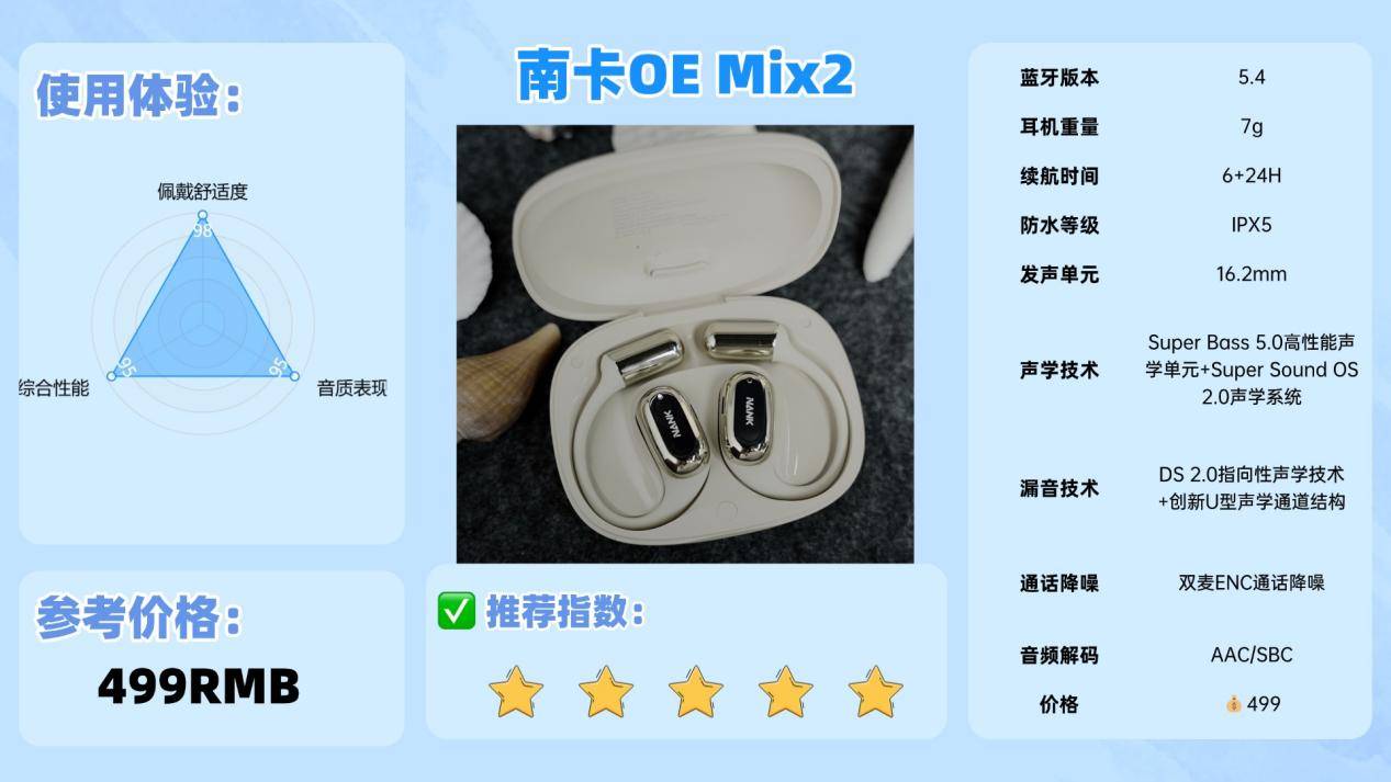 在性能配置上,南卡OE Mix2搭载高定制蓝牙5.4芯片SOC,连接响应更快、抗干扰更强,传输速度更高且功耗更低,延迟控制相当出色。续航方面可实现6+24小时长时使用,配备双麦Enc通话降噪、AI智能助手及IPX5防水设计,这样的配置即使放在千元档耳机中也属少见,足见诚意与实力。