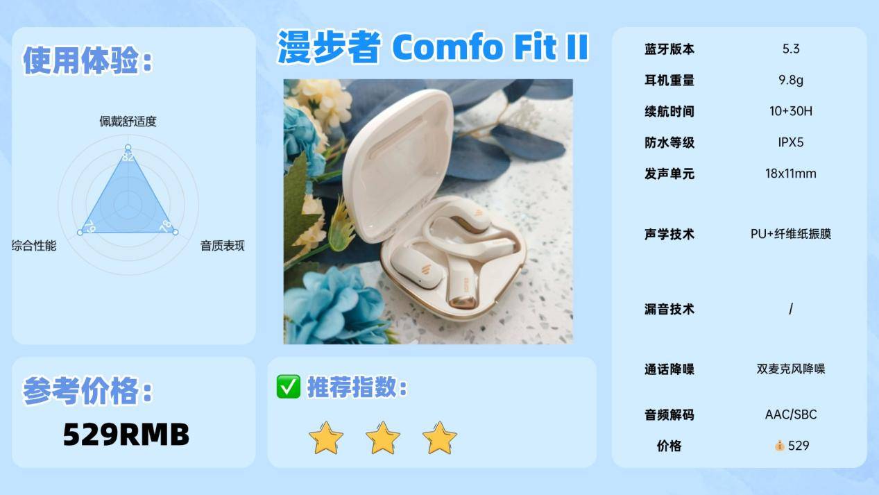 此外,Comfo Fit II具备IPX5防水等级,可轻松应对运动出汗或户外小雨等情况,让用户在运动、出行或日常佩戴中都能放心使用,是一款兼具舒适、实用与耐用性的全能型开放式耳机。