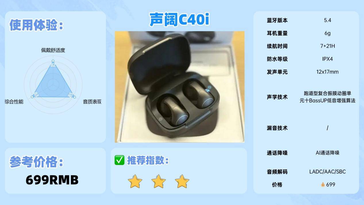 在音质表现上,C40i搭载12×17mm定制跑道型复合振膜动圈单元,并配合BassUP低音增强算法,对开放式设计可能带来的低频衰减进行了补偿,中高频的人声和乐器细节同样清晰自然。耳机内置蓝牙5.4芯片,确保连接稳定,并具备良好的抗干扰能力。