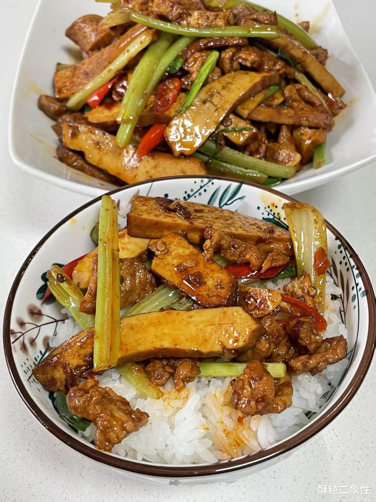 关火那瞬间,厨房灯泡仿佛自带柔焦:芹菜碧绿、香干油亮、肉片粉嫩,像给疲惫的眼睛做了套彩光SPA。盛饭,压紧,扣在盘子里,圆鼓鼓的小山包,浇两勺菜,汤汁顺着饭缝往下渗,第一口先吃芹菜,脆得像在牙齿间放烟花,第二口香干,咸鲜里透出豆乳的甜,第三口肉,嫩到让人怀疑之前吃的都是柴夫训练班。