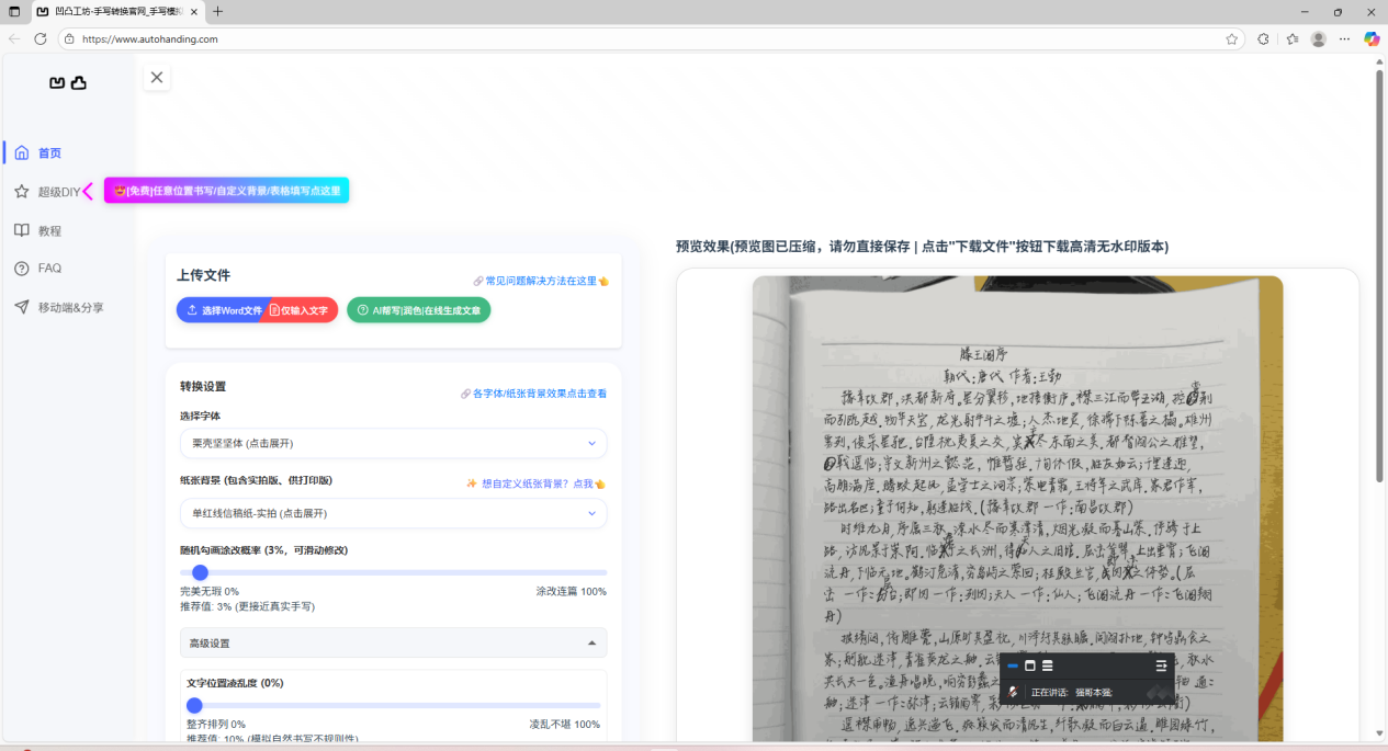 最关键的是这个网站完全免费,也无需注册上传文档后几秒钟就能生成预览效果,网站生成的手写稿质量非常高,并且支持高清无水印的图片下载,打印出来完全无压力,轻松应对各种场景。