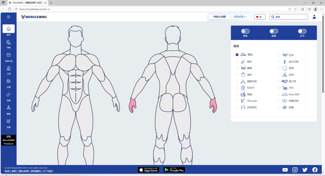 12、MUSCLEWIKI这是一个免费教你如何健身的神奇网站。可以根据人体肌肉图,选择想练的部位,例如想练腹肌,只需点击即可看到非常详细的教程。