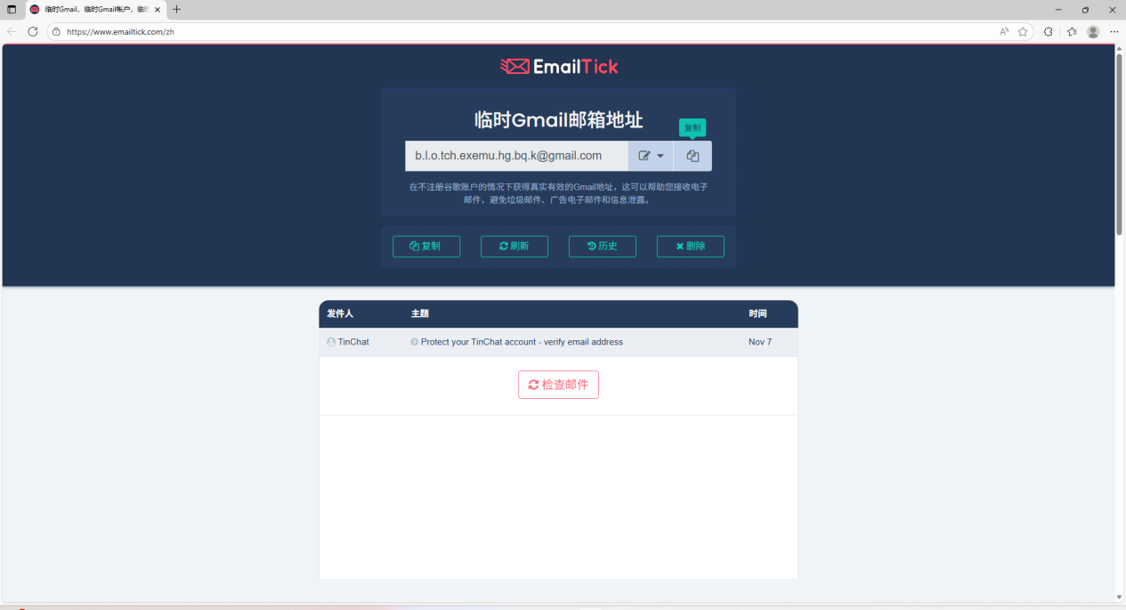 操作非常简单,打开网站 → 选择邮箱地址 → 点击复制 → 在目标网站注册 →返回邮箱页面即可查看验证码,还能在“历史记录”中重新接收以前的邮件,最关键的是,它无需登录、完全免费、没有广告,非常好用。