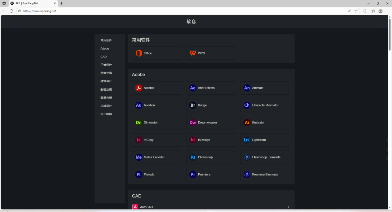 15、软仓这是一个能实现软件下载自由的免费网站,收录了 385 个专业软件,品类齐全。涵盖常见的 Office、WPS、PS、AI、AE、CAD,还有三维设计、影视动画、数据分析、机械设计等领域的必备软件。