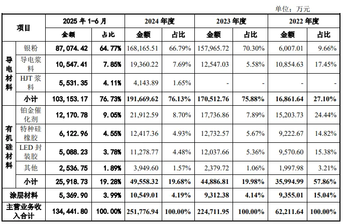 此外,贝特利的银粉业务高光,但产能利用率骤降的问题也引发监管关注。招股书显示,贝特利近年收入结构剧变,2022年至2024年主营业务收入从6.22亿元增至25.18亿元,导电材料占比从27.1%飙升至76.1%。而导电材料的增长核心正是光伏银粉,该产品收入从2022年的6007.01万元激增至2024年的16.82亿元,2023年营收占比一度高达70.30%。但2024年银粉产能利用率从2023年的101.5%骤降至49.5%,引发深交所对其成长性的问询。