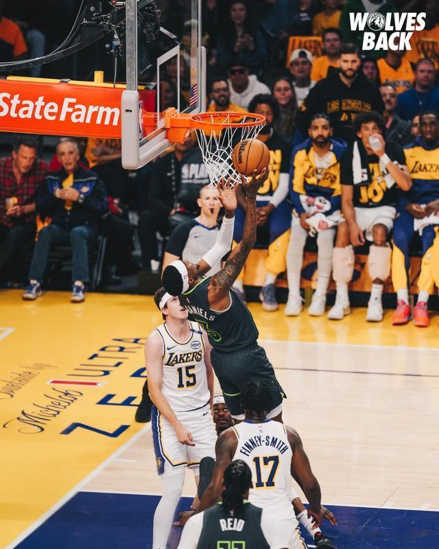 两人除了投射发挥极好之外,定点突破也让湖人防线顾此失彼。其实戈贝尔本场进攻参与度有限(仅6分5篮板),湖人胡乱给换防后多次将小个球员换防到他身边,但森林狼的传球不能及时送内线,但这时因为投射太顺,两人定点突破频频得手也在于湖人内线多由后卫补位,难以限制对手的冲击。