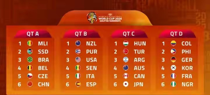 2026年女篮世界杯预选赛抽签结果新鲜出炉,参加这次预选赛的24支球队被分为4个小组,每个小组6支球队,中国女篮被分在A组。