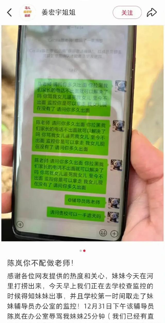 并且,姐姐表示自己掌握了是陈岚害死自己妹妹的直接证据,根据姐姐表示,在事发当天下午,陈岚把自己的妹妹叫到办公室足足辱骂了25分钟。