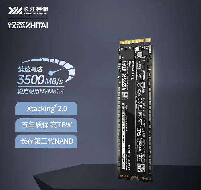 主硬盘强烈推荐NVMe M.2 SSD作为系统盘和游戏盘,速度快、免接线,是ITX装机首选。容量1TB更舒适价格已很亲民。当然,首选致态TiPlus5000 1TB NVMe M.2 SSD。