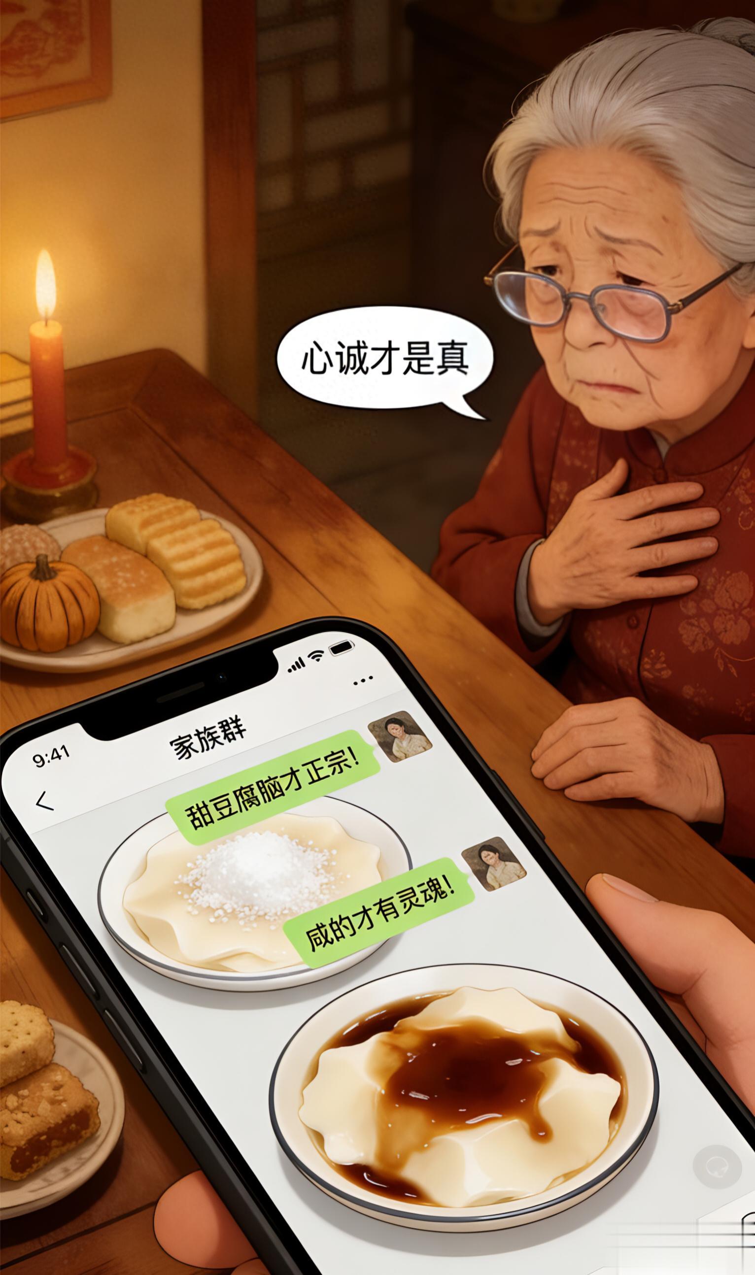 几分钟后,堂姐率先发言:“奶奶说得对,是我着相了。” 大伯母也发了个不好意思的表情:“听奶奶的,心意最重要。” 一场火药味十足的“甜咸之争”,被奶奶四两拨千斤地化解了。祭灶那天,各家各户想必都按照自己习惯准备了豆腐脑,甜的咸的都有,但心里都装着奶奶那句话:心诚才是真。