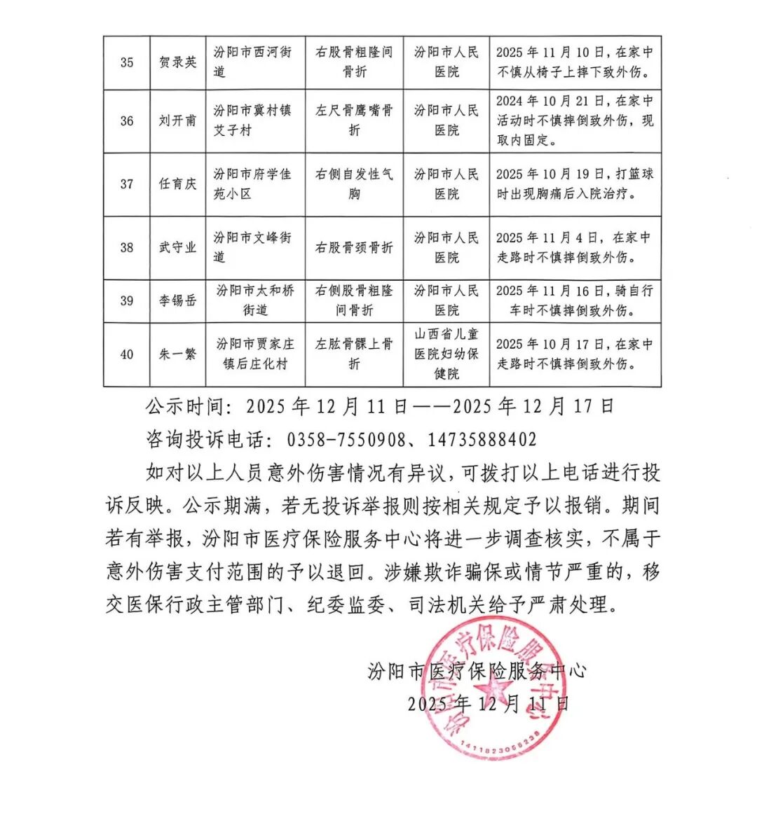 为保障广大参保人员意外伤害报销待遇,加强医保基金监管,确保医保基金使用安全,根据《中华人民共和国社会保险法》《社会保险经办条例》《吕梁市人民政府关于印发<吕梁市城乡居民基本医疗保险实施办法>的通知》(吕政发〔2017〕10号)和《山西省医疗保险管理服务中心关于印发<山西省医疗保障经办政务服务事项清单的通知>》(晋医险函〔2023〕153号)以及《汾阳市医疗保险服务中心关于成立意外伤害调查小组及做好参保人员意外伤害调查工作(试行)的通知》文件中关于意外伤害报销的有关要求,现通过我中心“微汾阳”信息公众号,每周对经过调查核实拟准予报销的参保人员姓名、家庭住址、疾病名称、就诊医院、受伤原因等情况进行公示。
