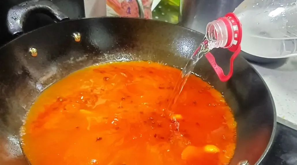 炒得差不多了以后,加入清水,这是我们一大早去山里打的山泉水。