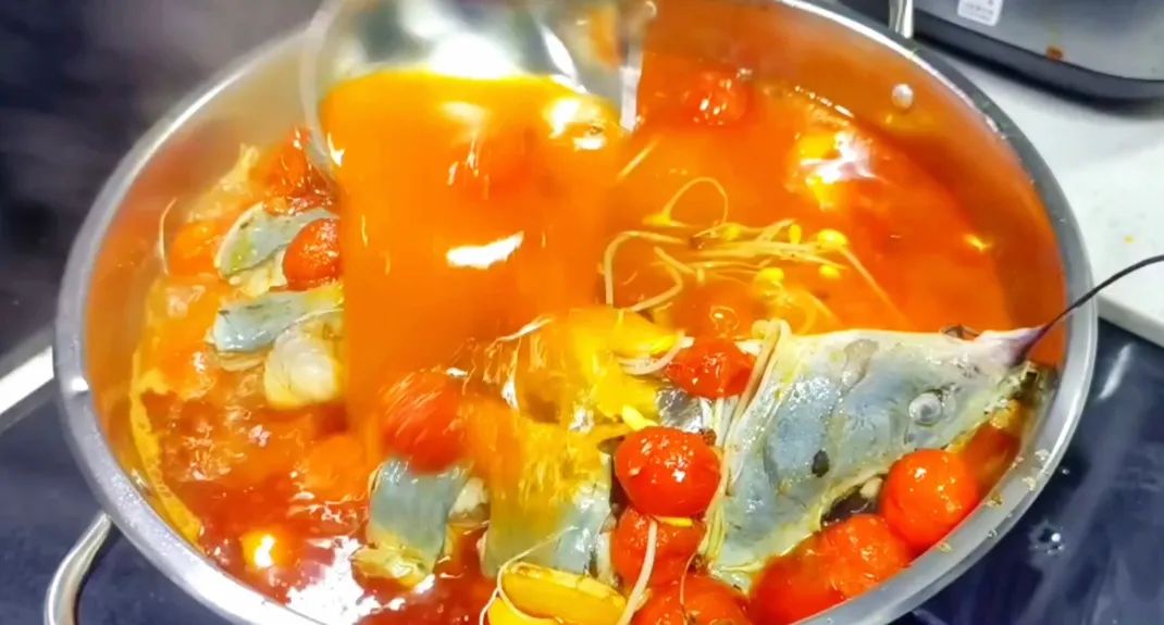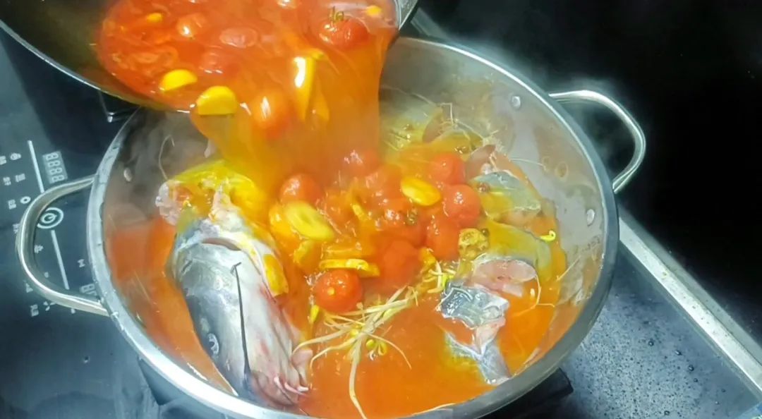 汤底炒好之后,倒入铺满底料和鱼的锅中,这里记得用文火煨煮。