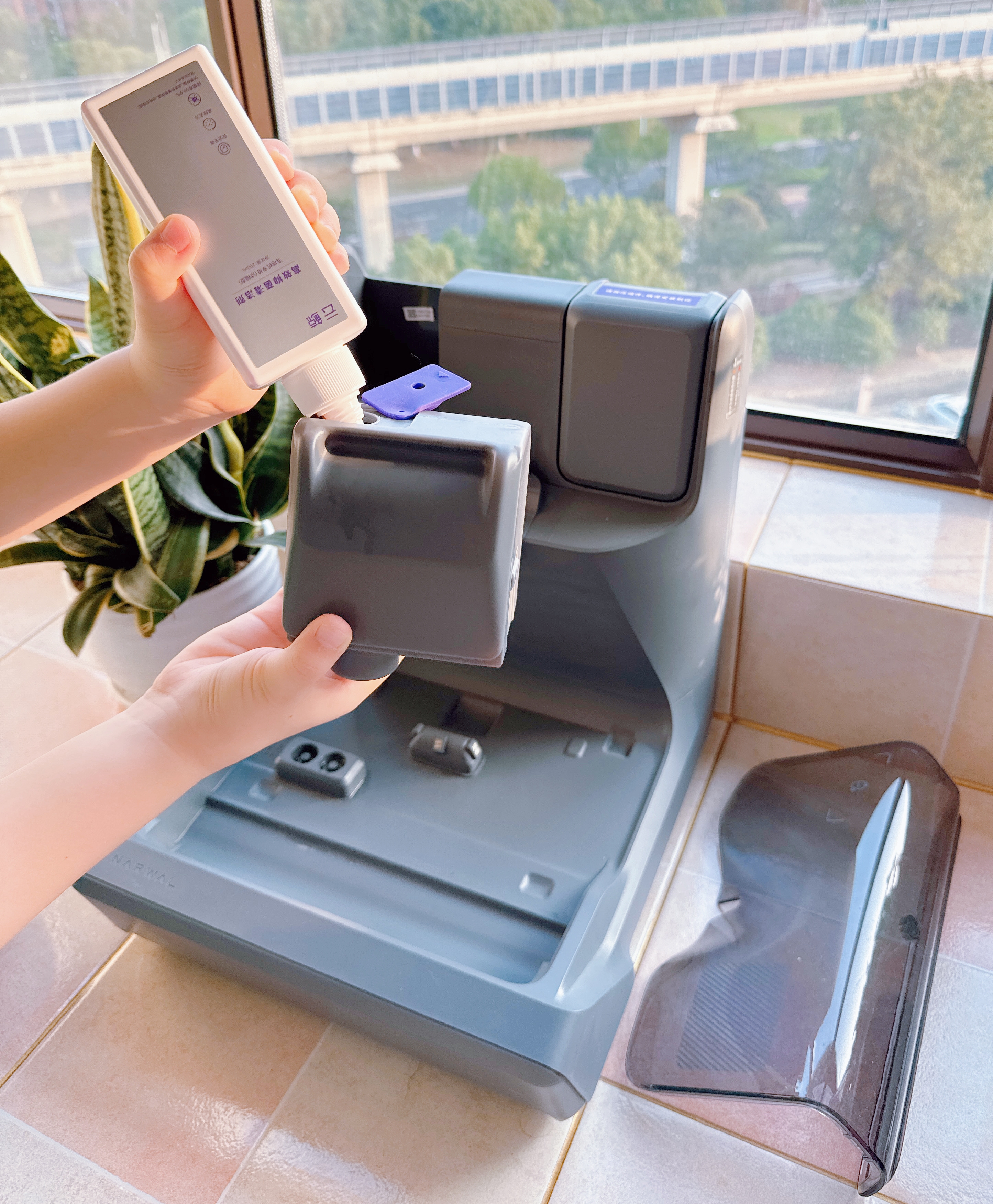 基站还能自动加注清洁剂,智能控制剂量配比,形成水、热、剂三效合一的协同作用。我们要做的仅仅是一股脑把一整瓶清洁剂倒入盒中。