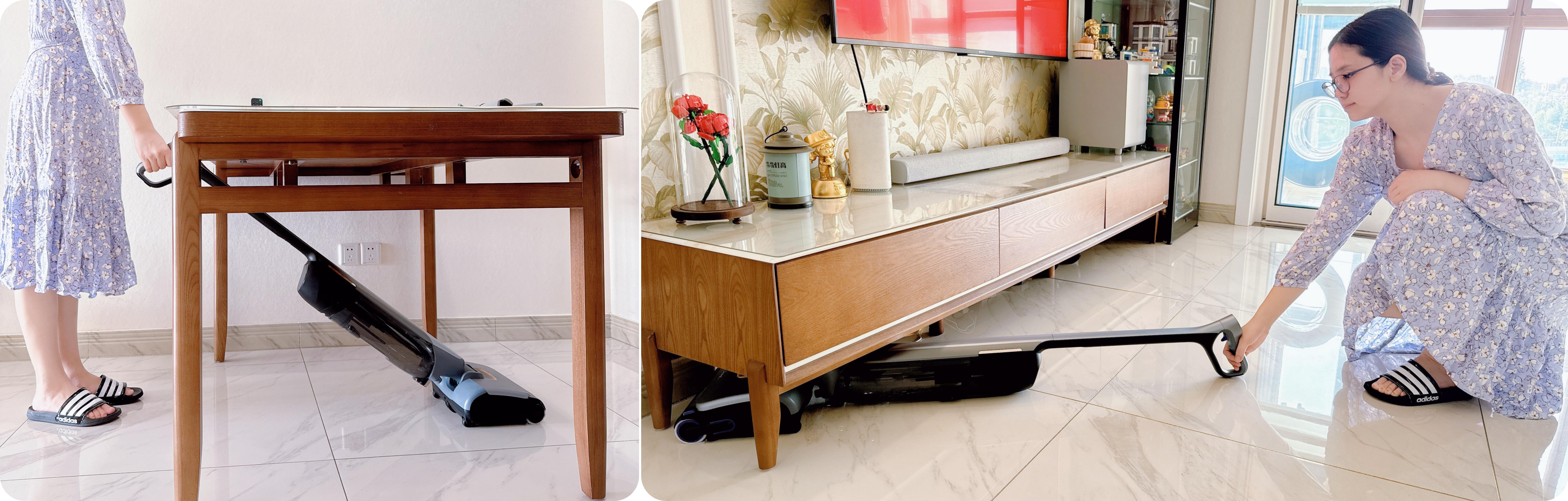 当180°躺平叠加63°大角度扭转的“双重Buff”,打扫桌腿椅脚时也方便很多,只需手腕轻扭便可精准控制转向角度,紧贴桌椅清洁不留缝隙。