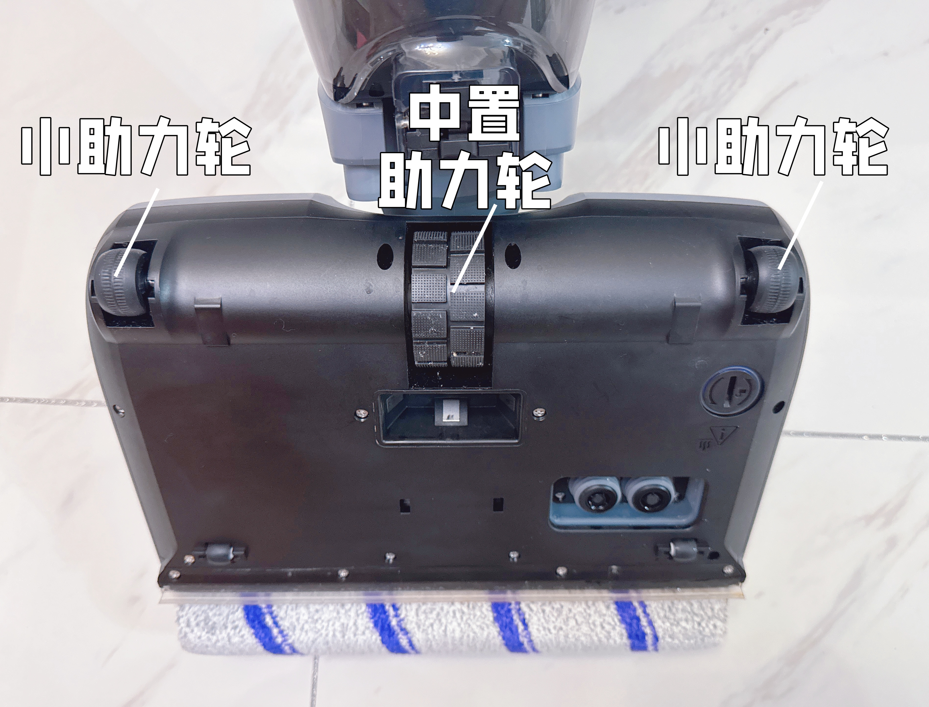后驱中置助力轮+两侧小助力轮能紧跟推拉节奏,与前面提到的清水箱、电池双下置设计相得益彰。