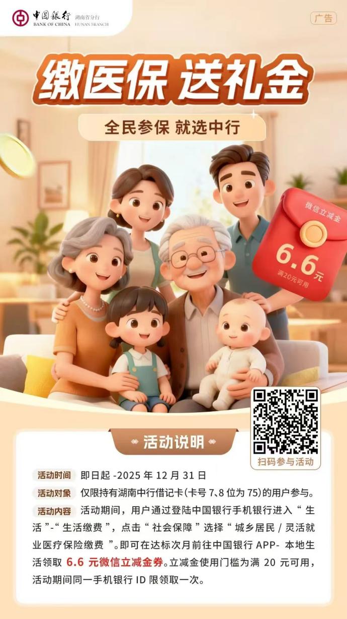 为鼓励居民积极参保并体验线上服务,中国银行湖南省分行同步推出惠民活动:即日起至2025年12月31日,用户登录中国银行手机银行APP即可领取6.6元微信立减金,通过金融科技赋能,进一步降低群众办事成本,提升参保便捷性。