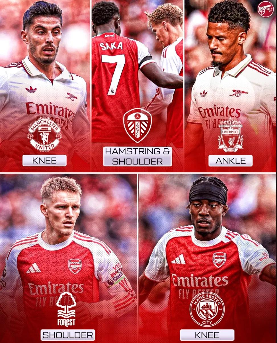 对曼联哈弗茨受伤,对利兹联萨卡和厄德高受伤,对利物浦萨利巴受伤,对诺丁汉森林厄德高再伤,对曼城马杜埃凯受伤。