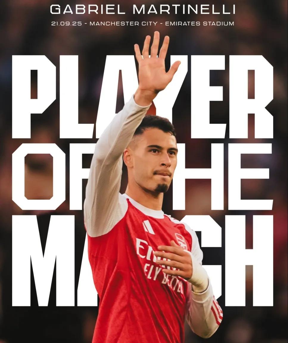 马丁内利被阿森纳官方票选为了对曼城一役的全场比赛最佳球员!