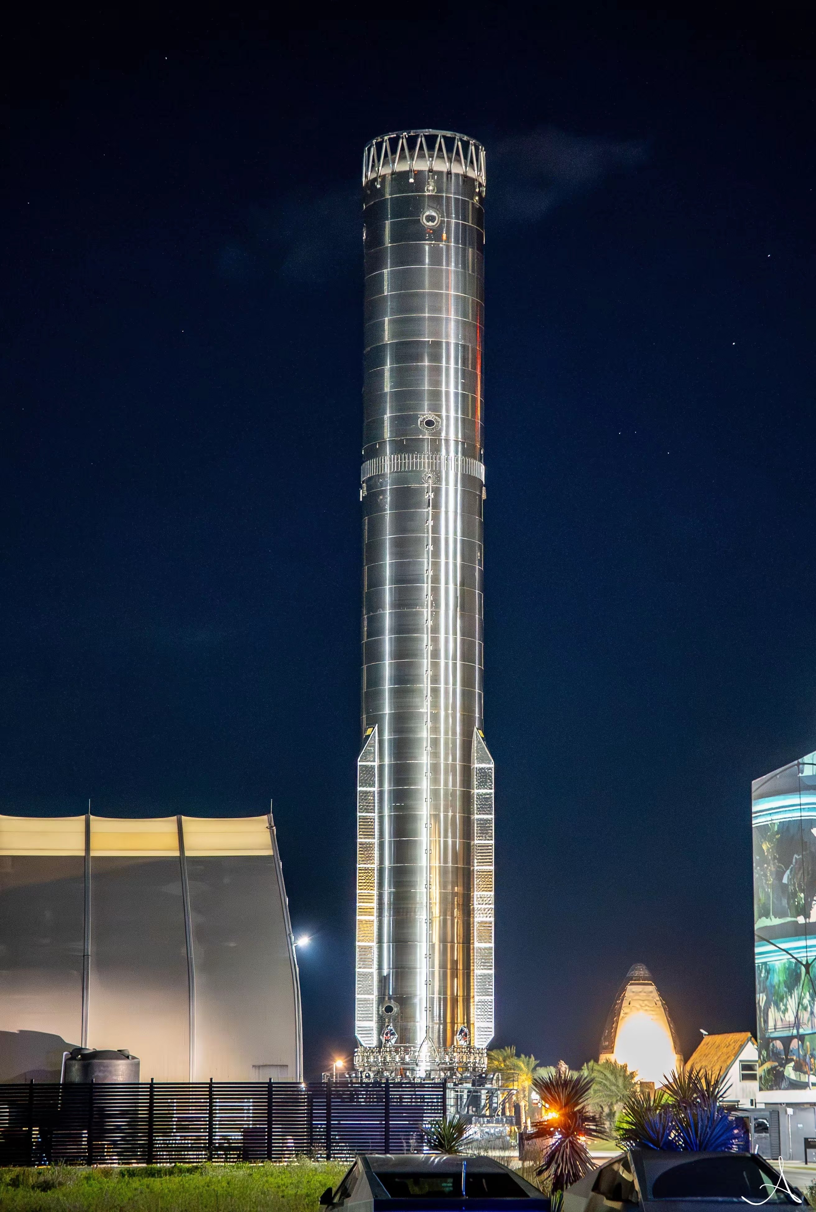 此次B19的转运全程氛围紧张且严谨,夜间强光照射下,这座高约70米、直径9米的不锈钢巨物缓缓移动,背景中Starbase的生产塔、发射塔轮廓清晰可见,红色警示灯闪烁,工作人员全程值守,尽显航天测试的严谨性。