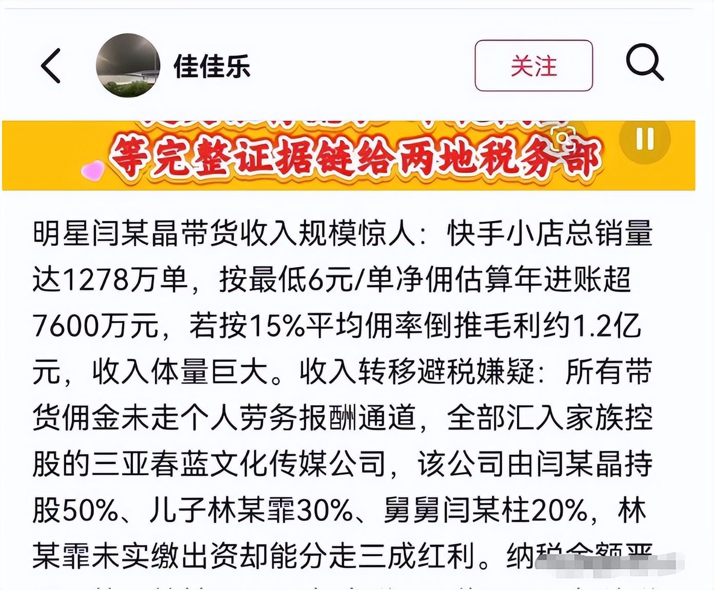 近日他直接公开了实名举报的相关信息,把矛头精准指向了闫学晶的直播带货收入。